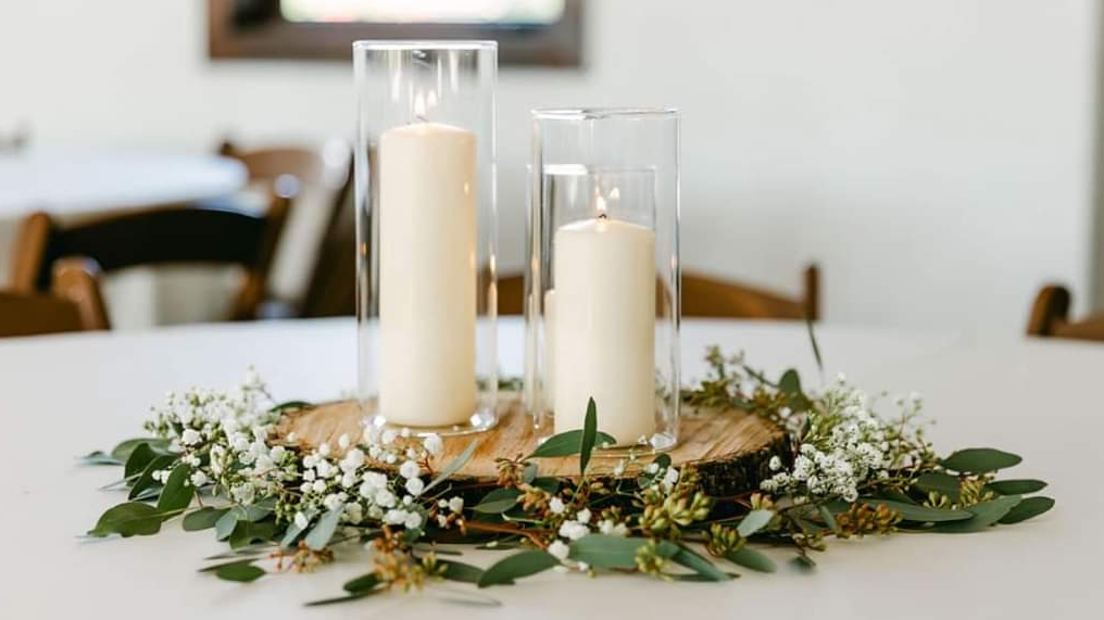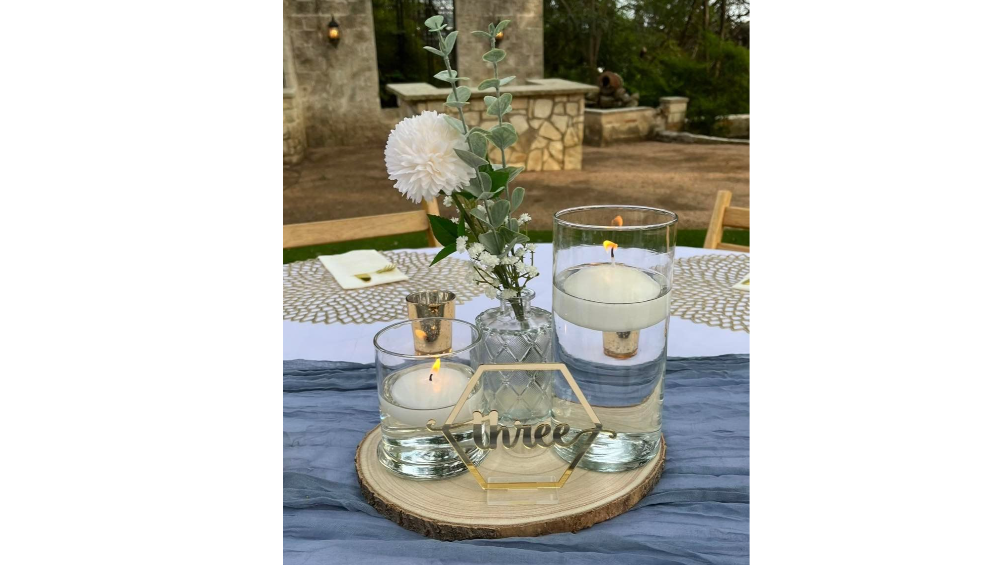Combination of Ivory lanterns, bronze lanterns, wood slices, gold colums, gold votives or 4" tall glass vases to decorate sixteen tables. Florals not included
