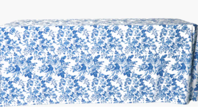 Blue French Toile Print Rectangular Tablecloth 108"x156"Bring opulence and a touch of European countryside romance to your event with our French toile tablecloth. French toile fabric is known for its detailed pastoral and floral motifs. The delicate blue patterns give your tablescape that chteau in Provence look.Features of Blue Toile de Jouy Rectangular TableclothA French toile tablecloth is a decorative table covering that celebrates history and artistry. It showcases an intricate floral and botanical toile print in rich royal blue over a white backdrop.The toile pattern is inspired by 18th-century French textiles, with their gorgeous scenes and detailed hand-drawn designs. Our blue toile fabric captures that whimsical classic charm, reminiscent of French countryside estates, tea rooms, and sunlit chteaux. Its a look that feels vintage and fresh, lending itself to a wide range of event themes.Made from 100% polyester, this toile fabric tablecloth merges beauty with practicality. Its lustrous fabric drapes smoothly over tables while maintaining a wrinkle-free look throughout your event. Its durable, easy to maintain, and designed to look picture-perfect from setup to send-off!Measuring 108" x 156", this rectangular tablecloth can fit multiple table sizes. On a 48" 96" banquet table, it provides a floor-length drape on all sides. When styled on a 30" x 96" banquet table, it offers a floor-length drop on the long side and a 6" puddle on the short sides.